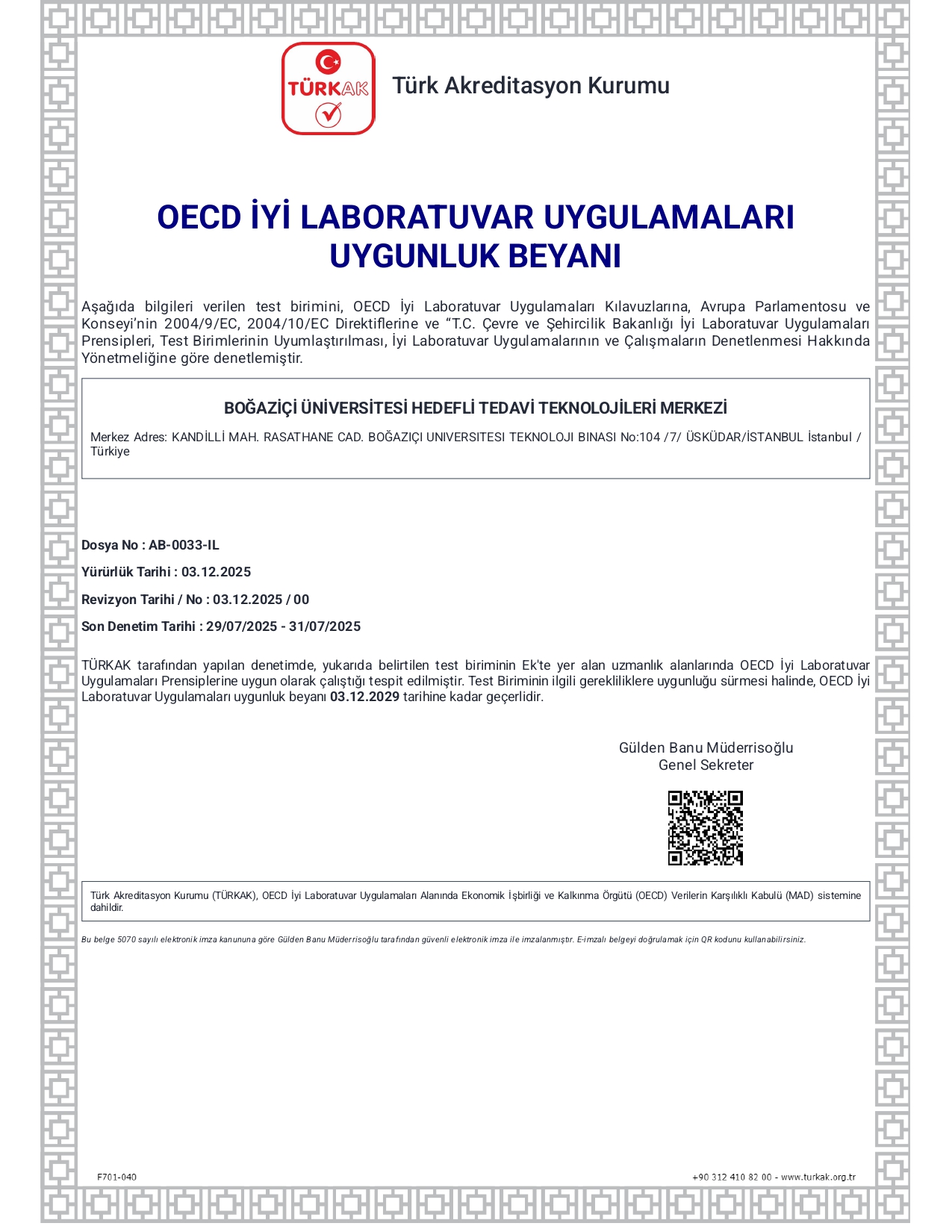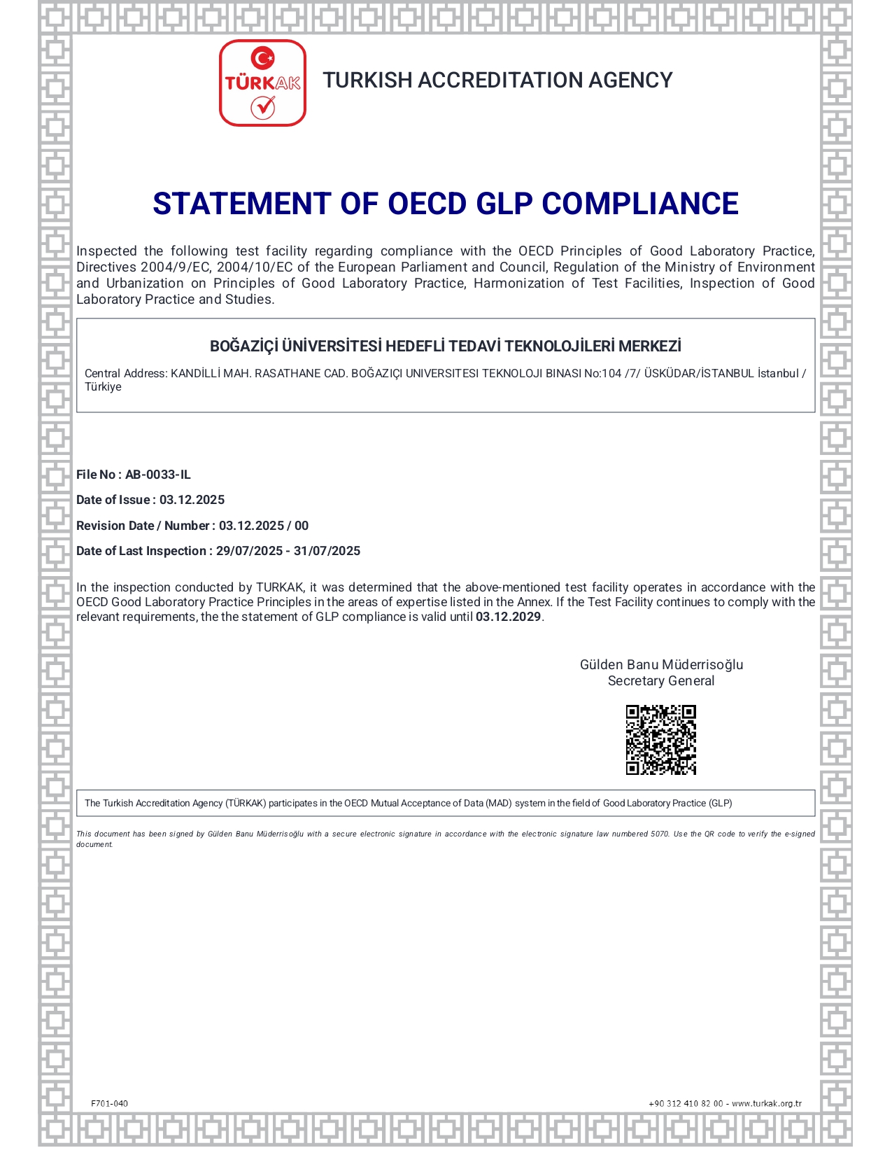Boğaziçi Üniversitesi Hedefli Tedavi Teknolojileri Merkezi (Boğaziçi CT3) OECD İyi Laboratuvar Uygulamaları (GLP) sertifikasını aldı! |